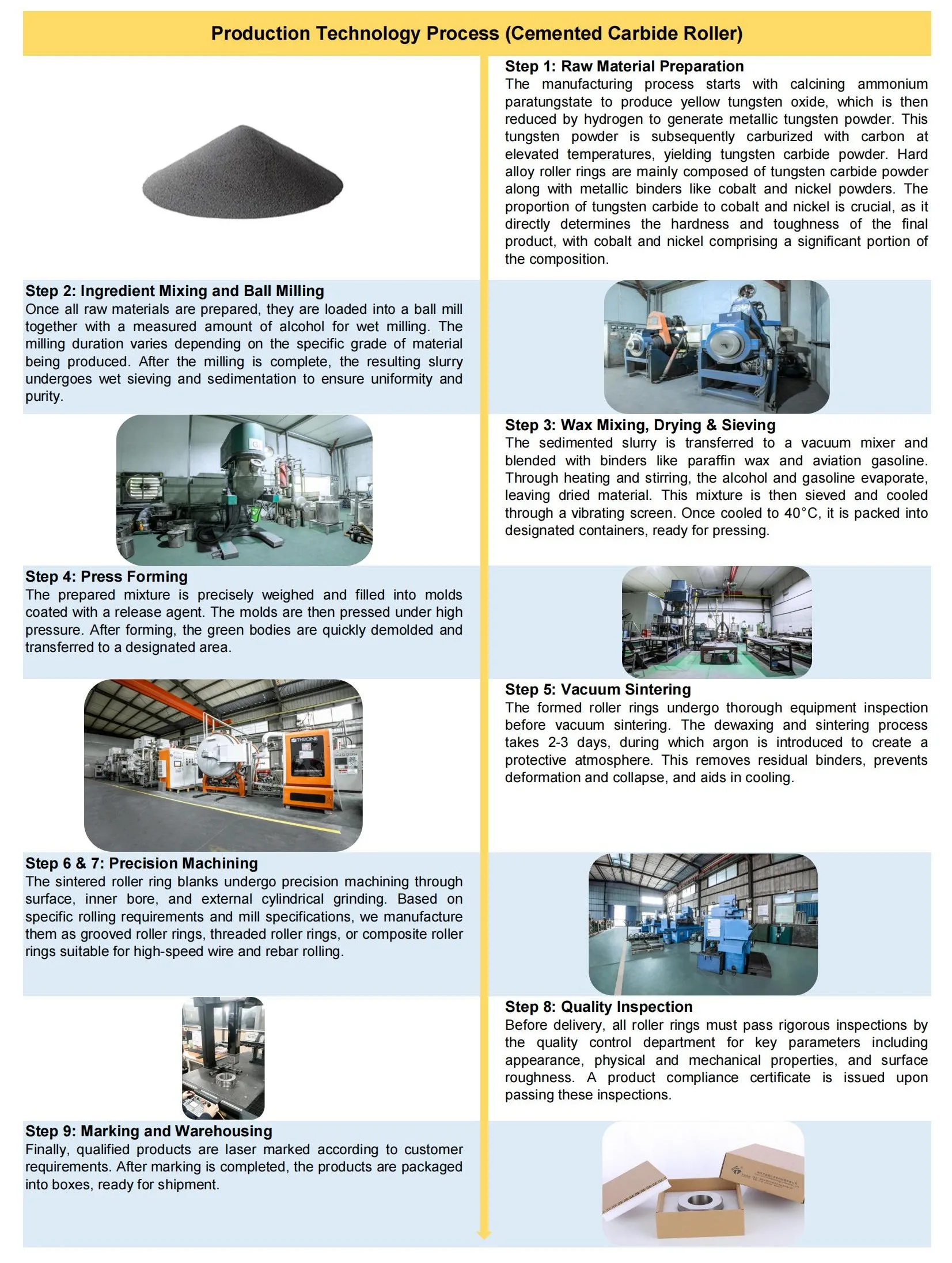 توفر حلقات لفات الكربيد الأسمنتية (المعروفة أيضًا باسم حلقات لفات كربيد التنجستن) توصيلًا حراريًا ممتازًا وتتفوق على الجيل الأول من لفات الحديد الزهر والفولاذ عالي السرعة في مقاومة الحرارة، ومقاومة التآكل، والقوة، مع الحد الأدنى من تقليل الصلابة عند درجات الحرارة العالية. تم تطويرها جنبًا إلى جنب مع مطاحن قضبان الأسلاك عالية السرعة، ويتم الآن تطبيقها على نطاق واسع في منصات التشطيب لتصنيع الأسلاك عالية السرعة، وقضبان التسليح، والقضبان الفولاذية المشوهة.